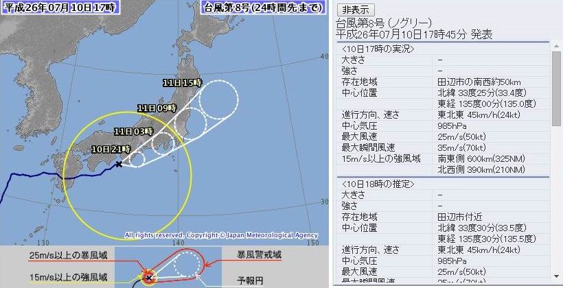 台風8号進路予想図と最新情報、へなちょこ台風に衰退www ※関西 ... from livedoor.blogimg.jp Jun 23, 2021 · 台風5号(チャンパー)は2021年6月23日正午現在、マリアナ諸島にあり、北寄りに進んでいる。気象庁の進路予想をみると、週末は本州に接近する. 台風 第5号 6月23日12時現在 マリアナ諸島 北緯 16.2゜ 東経 141.0゜ 北西 15 km/h 中心気圧 1002 hpa 最大風速 18 m/s 最大瞬間風速 25 m/s 強風半径(15m/s以上) 220 km 予報24日12時 台風 フィリピンの東 北緯 18.5゜ 東経 139.8゜ 北北西 10 km/h 中心気圧 1000 hpa 台風予想進路図(気象庁発表) 国際気象海洋(株) 提供(12:41) トップページへ戻る 台風 第 5号 6月23日12時 (印刷用) 動画.(52k) (android用flash動画) Oct 11, 2019 · 台風19号は「大雨特別警報」発表の可能性があり、「狩野川台風」に匹敵する恐れも。関東にとっては最悪の進路を通り、記録的な暴風や大雨と. Apr 17, 2021 · 台風2号はさらに発達して、来週前半には「猛烈な」勢力で、フィリピンの東を北上する予想です。この台風の影響で、沖縄地方は、20日頃から. 8月26日、16:58 全都道府県に対し「台風第10号警戒情報」を発出 8月29日、10:00 応急対策室長を長とする消防庁災害対策室を設置(第1次応急体制) 8月29日、14:37 全都道府県に対し「平成28年台風第10号への対応について」を発出し、対応に万全を期すよう要請