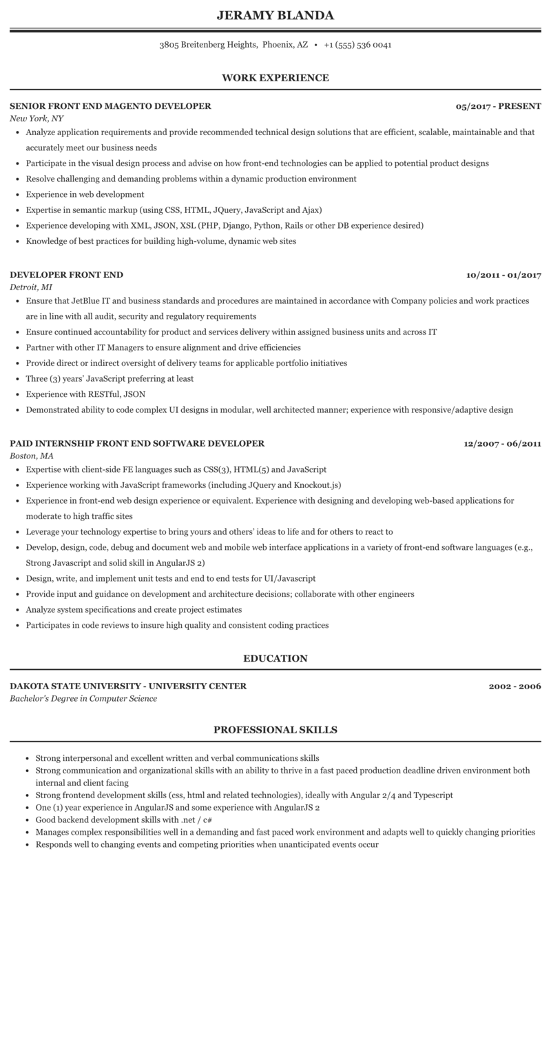 Sample Resume Of Front End Developer For Freshers / Awesome Salesforce Developer Resume Developer Resume ... : See 20+ resume templates and create your resume here.. Feb 29, 2020 · to make those seconds count, you need your resume to grab their attention right up front. Let us learn how to create an appealing python developer resume. Want to save time and have your resume ready in 5 minutes? Despite what some say, a resume objective should not be a statement about what you hope to gain from the position you're applying to. Administrative assistant resume objective "seeking position as an administrative assistant that allows for the application of experience in a previous role, as well as strong coordination, schedule management, project and deadline management, secretarial and support skills. related: